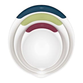 Produzido pela Americana OXO Good Grips, excelente conjunto de tigelas em plástico de alta qualidade, com alças macias e fundo antiderrapante. Conjunto de 3 tigelas em tamanhos diferentes para auxiliar no preparo de massas, saladas, ou servir direto à mesa. Alças coloridas e macias e fundo antiderrapante que garantem conforto e no manuseio. Design diferenciado com bico inteligente para a retirada do alimento evitando que haja desperdício e sujeira.Perfeito para misturar massas, marinadas, e muito mais. O seu interior curvo permite fácil mistura e limpeza. Recurso confortáveis, alças macias, antiderrapantes e fundos que continuam estabilizados durante o uso. Laváveis. Ficha técnica:- Código: 4080570349- Marca: OXO- Conteúdo da Embalagem: 1 Bowl de 14cm x 17cm com capacidade de 1,5 litros1 Bowl de 14cm x 22cm com capacidade de 3 litros1 Bowl de 14cm x 23cm com capacidade de 4,7 litros- Material: Plástico- Cor: Branco (detalhes coloridos )- Peso: 1,100kg- Dimensões: 30cm x 25cm x 14cm (AxLxP)- Garantia: 3 Meses - Contra de fabricação