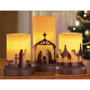 Velas LED de presépio de Natal sem chama, detalhes de decoração de casa de férias - Conjunto de 3 Descrição Celebre a temporada de Natal com este lindo conjunto de velas de 3 peças. Inclui 3 velas de LED cor marfim que ficam em cima de charmosas bases semelhantes a madeira com silhuetas intrincadas de presépio. As velas LED fornecem um brilho quente sem o perigo de uma chama aberta e a bagunça de cera derretida. Interruptor liga/desliga. Cada requisito. 2 pilhas AA (não incluídas). Resina/plástico. Cada vela tem 10 cm de diâmetro. Duas velas menores têm 12 cm de altura e a vela central tem 18 cm A. Tipo de material PE, resina, pó de pedra. - Celebre a temporada de Natal com este lindo conjunto de velas de 3 peças - Inclui 3 velas LED cor marfim que ficam em cima de bases charmosas semelhantes a madeira com silhuetas complexas de presépio - As velas LED fornecem um brilho quente sem o perigo de uma chama aberta e a bagunça da cera derretida - Interruptor liga/desliga | Cada requisito| 2 pilhas "AA" (não incluídas)