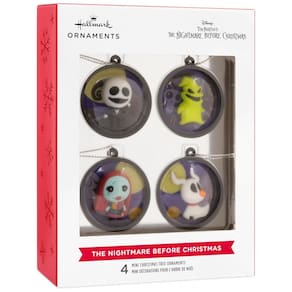 Marca: Hallmark Fabricante: Hallmark Modelo: Disney Tim Burton's The Nightmare Before Christmas Scenes Mini Christmas Ornaments Set of 4 Material: Plástico inquebrável Cor: Multicolorido (personagens icônicos) Dimensões aproximadas de cada enfeite: 3,8 cm x 4,4 cm x 4,3 cm Peso total do conjunto: 18,14 gramas Quantidade de peças: 4 Uso recomendado: Decoração natalina interna, pendurar na árvore Bateria: Não requer baterias Cuidados: Limpeza manual recomendada Origem: Importado