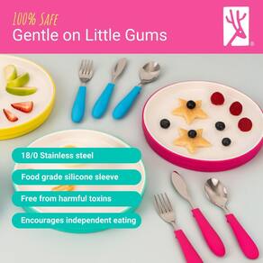 - Crianças mais velhas: Projetado para crianças mais velhas (mais de 4 anos) com alças mais longas e ponta de colher e garfo mais largos. A borda serrilhada da faca tem uma lâmina arredondada sem bordas afiadas para mantê-la segura para os dedinhos. Esta faca pode ser usada com segurança para cortar tudo, desde carnes e vegetais, incentivando a independência das crianças e construindo autoconfiança.