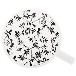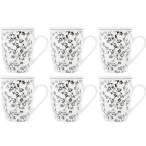 - Canecas brancas com estampa de flores na cor preta.