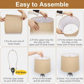 - Encaixe em aranha: adotando instaladores de aranha, os abajures marrons são projetados para ficarem no topo das harpas, acima das lâmpadas, e fixados por meio de remates aparafusados. Para sua conveniência, as harpas e remates E26 Base já estão incluídos.