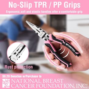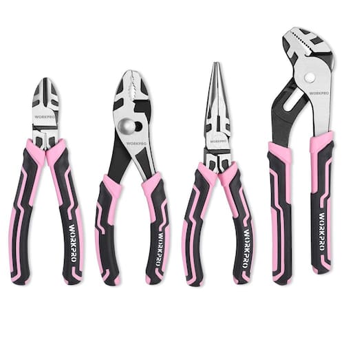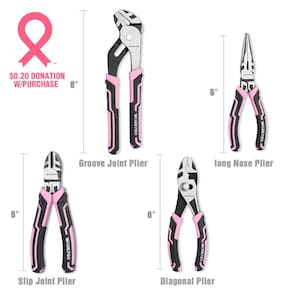 Conjunto de alicates Workpro de 4 peças (fita rosa) - Construído para durar: o conjunto de alicates é feito de aço CR-V e aço CR-NI, e a superfície é tratada termicamente e enegrecida para garantir maior dureza, melhor força de fixação, resistência e durabilidade. A aresta de corte endurecida melhora a conveniência de corte, e o polimento fino aumenta a resistência à corrosão. - Alicate de aplicação multiuso: um conjunto de alicates versátil, perfeito para encanamento, automotivo e aplicações gerais. - Alças ergonômicas e confortáveis: o conjunto de alicates de design elegante e bonito WORKPRO é equipado com alças TPR tri-material, extremamente confortáveis de segurar e usar, facilitando a manobra enquanto você trabalha. - O que você recebe: O conjunto de 4 alicates inclui alicates de ponta longa de 15 cm, alicate diagonal de 15 cm, alicate de junta de ranhura de 20 cm e alicate de junta deslizante de 15 cm. - Fita rosa: A WORKPRO Tools está doando US$ 0,20 desta compra para a National Breast Cancer FOUNDATION, Inc. A NBCF está ajudando mulheres agora, fornecendo serviços de detecção precoce, educação e suporte para pessoas afetadas pelo câncer de mama. De 1º de janeiro de 2024 a 31 de dezembro de 2024, sua compra deste produto resultará em um mínimo de doação ação de US$ 15 .000 para serem doados para Helping Women Now.