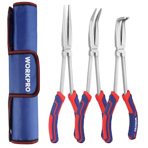 WORKPRO Conjunto de alicates de longo alcance de 3 peças, conjunto de alicates de ponta extra longa de 28 cm inclui alicates retos de longo alcance, alicates de ponta dobrada de 90°, alicates de ponta - O pacote inclui: nosso conjunto de alicates de longo alcance inclui alicates de ponta reta com agulha reta, alicate de ponta dobrada de 45°, alicate de nariz dobrado de 90° e uma bolsa de armazenamento com rolamento. Este conjunto de alicates longos de engenheiro é projetado para instalação e manutenção de máquinas, reparo de automóveis, motocicletas, manutenção de tubulações, etc - Alicate de longo alcance: o comprimento extra longo de 28 cm permite acesso a áreas de folga limitada/espaços apertados e mantém suas mãos longe de bordas afiadas, contornando facilmente obstruções, pegando peças pequenas, dobrando e cortando fios de metal. O design de alta alavancagem pode proporcionar máxima força de aderência com menos esforço - Aderência confortável: nossos alicates de nariz extra longo apresentam alças TPR tricolores para conforto extra e reduzem a fadiga das mãos, garantindo uma excelente experiência de conforto durante o trabalho prolongado. O design exclusivo antiderrapante oferece aderência extra para controle para obter mais eficiência - MATERIAL PREMIUM: o conjunto de alicates de longo alcance é feito de aço de alto carbono de alta qualidade com alta dureza e não quebra facilmente. O revestimento de níquel adicional melhora a resistência à corrosão da superfície. O óleo antiferrugem pode proteger o alicate da ferrugem; limpe-os antes de usar - MAIS APLICAÇÕES: Alicate reto de longo alcance e alicate de ponta dobrada para segurar peças pequenas, dobrar, modelar e torcer fios, segurar e puxar pequenos fixadores. Adequado para garagem doméstica, oficina profissional ou canteiro de obras