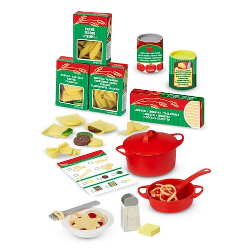 Conjunto de comida Melissa & Doug Prepara e Serve Pasta Play - Conjunto de mais de 50 peças de massa de feltro com guia de massa, instruções e utensílios para cozinhar e servir - Inclui penne de feltro, gravatas-borboleta, linguini e ravióli com 3 recheios, coberturas, potes de queijo e molho - Use uma panela durável com tampa e peneira no fogão impressos e na pia - Colher com colher de macarrão e sirva com tigela e garfo duráveis - Faz um ótimo presente para crianças em idade pré-escolar, de 3 a 6 anos, para jogar com as mãos e sem tela