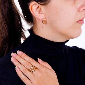 Conjunto de brincos e anel banhados a ouro e com detalhes em zircônias cristais, luxuoso que te deixa em destaque em qualquer situação.