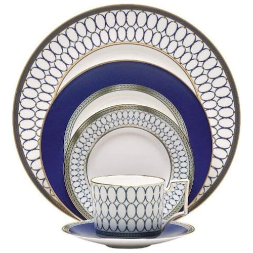 Este conjunto inclui prato de jantar, prato de salada, prato de sobremesa, prato de pão e manteiga, xícara de chá e pires de chá, todos feitos em porcelana fina. Cada peça é decorada com um acabamento azul Wedgwood vibrante e adornada com detalhes dourados intrincados, além de uma borda de louro neoclássica inspirada nos padrões históricos dos arquivos da marca, que adicionam um toque de luxo atemporal.