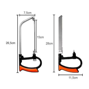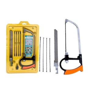 Mini Arco de Serra Multifunção Acompanha 4 Serras Finas de Aproximadamente 15cm e 1 Serra Grossa de Aproximadamente 20cm Incluso Drill e Parafuso Uso indicado em Alumínio, Madeira, Tubos PVC, Borracha, Pequenos trabalhos domésticos.