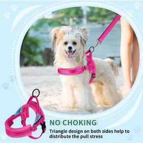 - Sem puxar e sem asfixia --- o design triangular em ambos os lados do arnês ajuda a distribuir o desconforto de puxar, além da coleira elástica conectada ao anel D nas costas do cão, torna o combo de arnês eficaz, sem puxar e não se preocupar com o cão sufocado quando puxado repentinamente.
