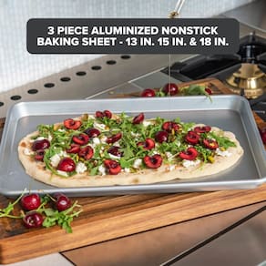 - Conjunto de assadeiras antiaderentes de 3 peças: inclui folha de 33 cm para pequenos lotes ou fornos torradeiras, 38 cm para biscoitos, bolos, carnes, jantares e 45 cm para refeições em família, legumes, pizza ou assados em grande lote. Feito de aço aluminizado durável para aquecimento uniforme