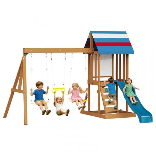 O conjunto de balanço de madeira Albott 6 em 1 oferece uma estrutura robusta em madeira natural com suporte tipo A para garantir estabilidade durante o uso. Possui uma torre com casa para brincar, equipada com um teto tipo tenda colorido que fornece sombra e um espaço de observação para crianças. O escorregador é projetado com formato em onda para proporcionar descidas seguras e suaves. Conta com dois balanços tipo cinto e uma barra trapezoidal, permitindo múltiplas modalidades de balanço simultaneamente. Inclui parede de escalada com apoios manuais para desenvolvimento de habilidades motoras, além de uma escada segura para acesso. O conjunto mede aproximadamente 245 cm de profundidade, 152 cm de largura e 245 cm de altura, ideal para uso em quintais ao ar livre. O produto é feito em madeira durável, adequado para uso externo prolongado.