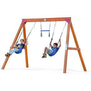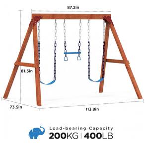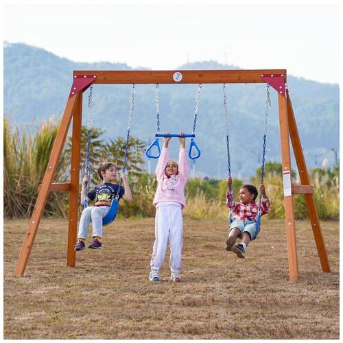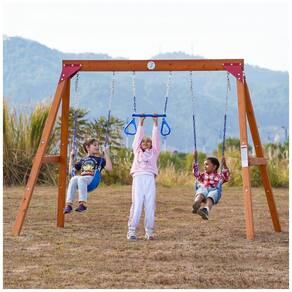 Conjunto de balanço modular para quintal, fabricado em madeira de cedro premium, oferecendo resistência natural à água, corrosão e rachaduras, ideal para uso externo prolongado. O design apresenta estrutura triangular estável em formato A-frame reforçado com suportes metálicos semiabertos que conectam vigas e postes firmemente. O sistema possui 7 furos especialmente posicionados para adaptação a diversos tipos de balanço, incluindo cintos clássicos, balanço ninho, tipo disco e barra trapezoidal, além de escadas de corda e balanço para bebês. As correntes são projetadas para evitar lesões por esmagamento de dedos ou enrosco de cabelo. Cada poste é ancorado ao solo em duas direções diferentes para maior estabilidade e segurança estrutural. Suporta peso máximo recomendado de 181 kg (400 lbs) e acomoda até 3 assentos ajustáveis. Medidas aproximadas de 188 cm (altura) x 183 cm (largura) x 188 cm (profundidade). Requer montagem com manual detalhado, hardware dividido conforme etapas e 10% de peças extras para facilitar o processo.