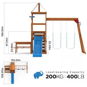 Estrutura fabricada em madeira de cedro de alta qualidade, conferindo resistência à água, corrosão e rachaduras, adequada para uso externo em diferentes condições climáticas. O conjunto inclui barra de macaco para desenvolvimento do equilíbrio, mesa externa 2 em 1 que funciona como mesa de piquenique ou mesa de areia, escorregador em estilo onda com 1,83 m, parede de escalada, forte com telescópio para brincadeiras criativas, e dois balanços de cinto com correntes projetadas para segurança, evitando lesões por dedos ou cabelos presos. A construção possui parafusos resistentes a rachaduras na madeira e suportes com duas ancoragens por poste para estabilidade reforçada. Medidas aproximadas de 322 cm (profundidade) x 386 cm (largura) x 276 cm (altura). Capacidade máxima de peso suportada de até 200 kg. Indicado para crianças dos 3 aos 10 anos. Requer montagem detalhada com manual e hardware separados conforme etapa.