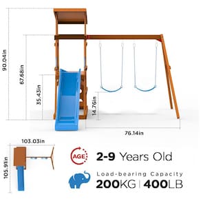 Conjunto de balanço para área externa fabricado em madeira de cedro de alta qualidade, com propriedades naturais de resistência à água, corrosão e rachaduras, adequado para uso em qualquer clima. Inclui escorregador de 1,83 m em formato de onda, dois balanços com cintos ajustáveis em altura, forte com cobertura, parede de escalada com design geométrico e espaço inferior para caixa de areia que pode ser acessada por crianças. A embalagem inclui hardware organizado para facilitar a montagem, com 10% de peças extras e manual detalhado em 3D. As correntes do balanço possuem sistema que evita ferimentos nos dedos e enrosco de cabelos. A estrutura é reforçada com parafusos resistentes a rachaduras e ancoragens duplas em cada poste proporcionando estabilidade e segurança. O produto mede aproximadamente 269 cm (profundidade) x 262 cm (largura) x 229 cm (altura). Suporta até 181 kg de peso total, adequado para crianças de 2 a 9 anos. Requer montagem detalhada.