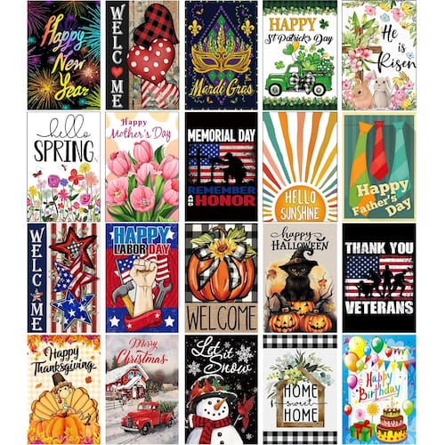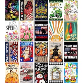 Por que escolher nosso conjunto de bandeiras de jardim de 20 peças? Decoração o ano todo: Perfeito para todas as estações e feriados. Qualidade premium: durável, resistente ao clima e resistente ao desbotamento. Design frente e verso: ambos os lados são legíveis e vibrantes. Fácil de instalar: Serve para todos os suportes de mastro de bandeira de jardim padrão. Designs atraentes: ilumine seu espaço ao ar livre com estampas alegres. Melhore seu jardim com nosso conjunto de bandeiras de jardim de 20 peças e desfrute de um espaço ao ar livre lindamente decorado durante todo o ano! - 1. ?Coleção abrangente de bandeiras de jardim?: Nosso conjunto de bandeiras de jardim inclui todos os principais temas: primavera, verão, outono, inverno, feliz ano novo, feliz dia dos namorados, carnaval, dia de São Patrício, Páscoa, feliz dia das mães, dia da memória, feliz dia dos pais, 4 de julho, feliz dia do trabalho, Halloween, obrigado veteranos, ação de graças, lar doce lar, aniversário, bandeira de jardim de Natal. Com 20 designs exclusivos, este conjunto atende a uma ampla variedade de ocasiões e estações, garantindo que você esteja sempre preparado. - 2. ?Design frente e verso com qualidade superior?: Estas bandeiras vibrantes, coloridas e encantadoras apresentam um design frente e verso com 3 camadas de tecido. Ambos os lados são legíveis e o tecido prateado médio evita transparência. Feitas de materiais de qualidade premium, estas bandeiras são duráveis, resistentes ao clima, resistentes ao desbotamento e feitas para durar. - 3. ?Instalação sem esforço?: Cada bandeira de quintal mede 30 x 45 cm com uma abertura de 5 cm, encaixando-se perfeitamente em todos os suportes de mastro de bandeira de jardim padrão (suporte não incluído). A instalação é fácil, permitindo que você aproveite suas lindas bandeiras em pouco tempo. - 4. ?Versátil e atraente?: Melhore o exterior da sua casa com estas deslumbrantes bandeiras de jardim ao ar livre. Comemore com sua família e amigos e chame a atenção no seu bairro. Estas bandeiras são perfeitas para decorar seu quintal, gramado ou jardim. - 5. ?Impressão premium vívida?: Uma das características de destaque de nossas bandeiras sazonais ao ar livre é a impressão brilhante e alegre. Cada design é feito para iluminar seu espaço ao ar livre, trazendo um toque personalizado ao seu jardim com essas bandeiras sazonais de design exclusivo.