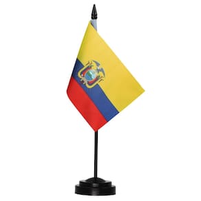 - Artesanato - Importado. Feito de poliéster 100% durável e bastões de plástico sólido preto com ponta de lança. Vem com uma base de plástico preto para manter a bandeira do Equador em pé em sua mesa