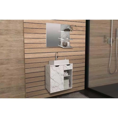 Conjunto de Banheiro Armário c/ Espelho BN3608 e Balcão Suspenso BN3605 c/ Cuba Pia BN3600 60cm cor Mármore Branco - Tecno Mobili Abaixo segue os produtos do KIT: Conjunto de Banheiro Armário c/ Espelho BN3608 e Balcão Suspenso BN3605 c/ Cuba Pia BN3600 60cm cor Mármore Branco - Tecno Mobili Gabinete de Banheiro Suspenso BN3605 1 Porta 1 Gaveta 60cm cor Mármore Branco - Tecno Mobili