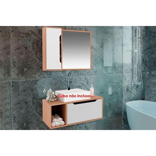 Abaixo segue os produtos do KIT: Conjunto de Banheiro Balcão Suspenso BN3644 e Balcão c/ Rodízios BN3643 80cm e Armário c/ Espelho BN3645 80cm Amêndoa/Branco - Tecno Mobili