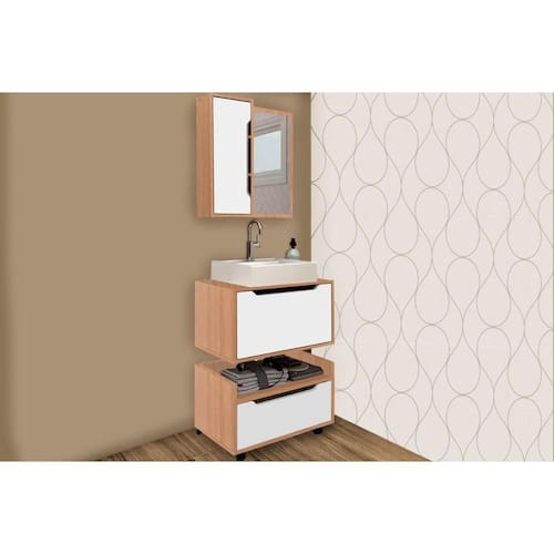Gabinete de Banheiro Suspenso c/ Rodizio BN3647 s/ Cuba c/ 1 Gaveta 60cm Amêndoa/Branco - Tecno Mobili