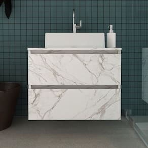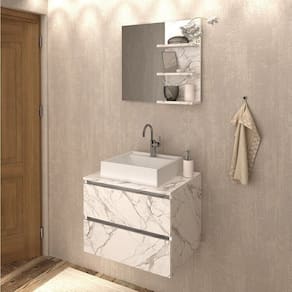 Conjunto de Banheiro com Gabinete Suspenso 2 Gavetas e Espelheira com 3 Prateleiras Mármore/Branco