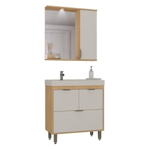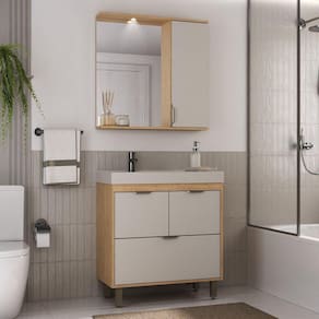 Conjuntos de Banheiro 80 cm carvalho marrom com frente arenas. Balcão possui um gaveteiro na parte inferior e duas portas na superior. A espelheira tem uma porta, suporte para escova e uma luminária de LED. O tampo foi desenvolvido na cor do móvel, com maior profundidade na cuba e os pés possuem sapatas com regulagem de altura para nivelamento do produto.