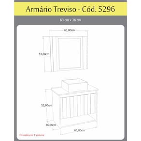 O armário kit Treviso possui composição harmoniosa entre espelheiro e armário, com design estilo ripado que o deixa mais moderno e bonito além de prático, com sua gaveta interna que facilita na organização dos objetos, nicho inferior com ótimo espaço interno e porta de bascular com pistão a gás para uma abertura suave. Sua estrutura é 100% em MDP – BP amadeirado ou texturizado, e possui várias opções de tampo e cuba de sobrepor se adequando a todos os tipos de ambientes, e ao gosto do cliente. Acabamento da Cuba: Gel Acabamento da Gaveta: BP Acabamento da Porta: BP Acompanha Cuba: Sim Acompanha Tampo: Sim Ambiente Principal: Banheiro Complexidade da Montagem: Baixa: pode ser montado por uma pessoa sozinha Cor: Nogal Sevilha/Branco Cor da Cuba: Gelo Cor do Produto: Nogal Sevilha/Branco Cor Interna: Branco Escala de Brilho: Semi-Fosco Escala de Brilho da Gaveta: Semi-Fosco Escala de Brilho da Porta: Semi-Fosco Espessura do Espelho: 3 mm Formato do Espelho: Retangular Furação para Cuba e Torneira: Não Gaveta com Chave: Não Itens Inclusos: 1 Gabinete, 1 Espelheira, 1 Cuba, Manual de Instalação e Kit Ferragens Linha ou Coleção: Treviso Manual de Especificação Técnica: https://cdn2.madeiramadeira.com.br/atributo/a-j-rorato-moveis/1369967-treviso-tecnica.pdf Manual de Montagem e Instalação: https://cdn2.madeiramadeira.com.br/atributo/a-j-rorato-moveis/1369962-treviso-instrucoes.pdf Material da Cuba: Mármore Sintético Material da Gaveta: MDF/MDP Material da Porta: MDF/MDP Material do Tampo: Mármore Sintético Material Principal: MDF/MDP Medida da Cuba (C x L x P): 35,5cm x 32cm x 13cm Medida da Espelheira (A x L x P): 53,6cm x 63cm Medida do Gabinete (A x L x P): 53,8cm x 63cm x 36cm Necessita Montagem: Sim Origem do Produto: Nacional Peso: 32,41 kg Peso Máximo por Gaveta: 1 kg Possui Espelheira: Sim Possui Gabinete: Sim Possui Gavetas: 01 Possui iluminação: Não Possui Pés: Suspenso Possui Portas: 01 Possui Rodízio: Não Recomendações de Uso, Manutenção e Limpeza: Nunca utilize esponja tipo bombril para a limpeza de seu armário e pia e nem produtos abrasivos, para limpeza utilize uma flanela limpa e seca. A exposição a luz solar pode modificar a cor único do produto. Sistema de Montagem: Parafusos Tamanho do Espelho (A x L): 53,6cm x 63cm Tipo de Corrediça da Gaveta: Metálica Telescópica Tipo de Dobradiça/Corrediça da Porta: Metálica Tipo de Gabinete: Gabinete Suspenso Tipo de Porta: Basculante Tipo de Puxador da Gaveta: Embutido Tipo de Puxador da Porta: Não Contém