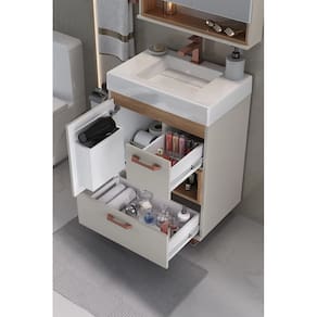 O Conjunto Mariana é um lançamento super versátil da Fabribam. A cor Nude, suave e contemporânea, junto aos detalhes em Catedral, para combinar, o móvel vai com pés e puxadores na cor cobre, o que adiciona um toque de sofisticação. Reparou no nicho? É perfeito para armazenar toalhas, produtos de higiene pessoal ou decorações. O Gabinete Mariana é robusto e oferece ótimo aproveitamento de espaço com duas gavetas com corrediça telescópica e conta com um diferencial: uma porta com suporte para secador de cabelo, o que o torna ainda mais funcional para o uso diário. O conjunto inclui a espelheira Mariana, na mesma cor Nude, complementada pelo tom Catedral, que dispõe de duas portas com espelhos amplos, sistema de fechamento com amortecedor e prateleiras internas espaçosas. Para complementar, o Lavatório, com seu design contemporâneo, acrescenta um toque final de sofisticação ao conjunto. Sem dúvida, é a escolha ideal para quem deseja renovar o banheiro com elegância, praticidade e um toque de modernidade.