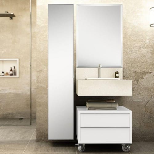 Gaveteiro com rodízios fabricado em MDP BP (15 e 25mm), possui puxadores de alumínio anodizado, gavetas com corrediças metálicas, organizador de escovas e produtos dentais (removível e lavável). Acompanha rodízios de gel (35mm) ultra deslizantes, com dispositivos de freio. Espelho Cristal 03 mm com acabamento bisotê, estruturado em painel de MDF. Armário Vertical é fabricado em MDP BP (15mm e 18mm), puxador de alumínio anodizado, porta com dobradiças grandes (35mm) e prateleiras com suportes de aço, porta espelhada para o corpo inteiro, espelho com película de proteção emoldurado em reforçado perfil de alumínio. Bancada para Banheiro é fabricada em porcelanato técnico polido, acompanha cuba embutida em louça, mais frontão frontal e frontão lateral. Ideal para compor com os gaveteiros Max Possui Rodízio: Sim Ambiente: null Ambiente Principal: Banheiro Cor: Branco Cor Predominante: Branco Informação Complementar: 1x Espelho para Banheiro 60cmx80cm Bisotê Blu Espelho Largura: 60 cm Altura: 80 cm Peso: 7,4 kg Profundidade: 1,2 cm Necessita Montagem: Não