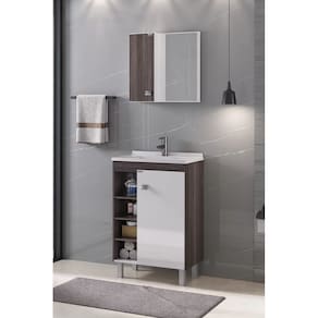 O Kit Sophia possui gabinete com pés com estrutura amadeirada, podendo escolher entre 3 opções de cores, portinha ampla e nichos laterais onde os objetos de uso cotidiano podem ajudar a compor a decoração. Acompanha lavatório Soft em mármore sintético com capacidade de 6 litros e uma espelheira com espelho amplo e portinha lateral com prateleira interna oferecendo espaço adicional para guardar itens menores . Um conjunto lindo para manter toda organização e praticidade que você e sua família merecem!