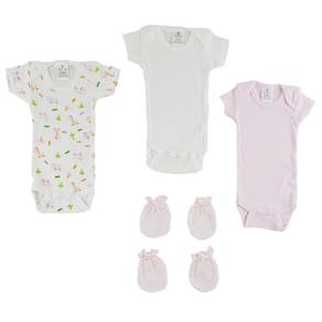 Conjunto de banho Bambini perfeito para qualquer bebê recém-nascido, feito de roupas de bebê de algodão macio e aconchegante, mantendo os pequenos confortáveis. Este conjunto é o presente de chá de bebê perfeito para qualquer futura mamãe. Características. Macacões e luvas prematuros. Feito de tecido de algodão macio para conforto e respirabilidade. Lavar à máquina e secar na secadora. Inclui 2 peças. Pacote de 3 luvas infantis Preemie Girls de manga curta, 100% algodão, luvas infantis rosa, especificações da camiseta de luvas infantis rosa. Cor rosa. Tamanho Preemie