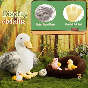 Celebre a alegria da vida na fazenda e as tradições da Páscoa com o conjunto de bichos de pelúcia BENINY de 8 peças! Esta adorável coleção de pelúcia inclui uma gentil mãe pato, três patinhos fofos, três ovos coloridos e um ninho aconchegante, tudo projetado para inspirar brincadeiras imaginativas sem fim. Feitos de materiais de pelúcia ultramacios, seguros para crianças, estes brinquedos de pato são perfeitos para mãos pequenas abraçarem, carregarem e cuidarem. Se o seu filho está reencenando aventuras na fazenda, "chocando" ovos ou se aconchegando para histórias para dormir, este conjunto estimula a criatividade e o vínculo emocional. Ideal para cestas de Páscoa, surpresas do dia das crianças ou meias de Natal, este conjunto de pelúcia de pato funciona como uma encantadora peça de decoração de berçário. O recurso de corda (opcional) adiciona diversão interativa, enquanto os detalhes realistas e cores vibrantes o tornam um presente de destaque para crianças, pais ou amantes de animais. Seguro, durável e irresistivelmente fofo, o conjunto de pelúcia BENINY Duck traz magia de quintal para todas as casas! - Conjunto de pelúcia de pato para diversão sem fim: esta adorável coleção de pelúcia inclui 1 pato mãe grande, 3 patos fofos, 3 ovos e 1 ninho aconchegante — perfeito para brincadeiras temáticas de fazenda, celebrações de Páscoa ou histórias imaginativas. - Estimula brincadeiras imaginativas: desperte a criatividade com aventuras na fazenda, ovos "chocando" e atividades de RPG que promovem vínculo emocional, habilidades de contar histórias e amor pelos animais. - Pato de pelúcia com design realista: com características realistas de pato e um ninho confortável, este conjunto traz charme de quintal para brincar ou decoração de casa, tornando-o uma adição de destaque a qualquer coleção. - Presente perfeito para feriados e qualquer ocasião: ideal para cestas de Páscoa, meias de Natal, surpresas do dia das crianças ou como uma peça de decoração de berçário, este conjunto de pelúcia de pato é um presente emocionante para crianças, pais e amantes de animais. - Material que deixa a mente da mamãe à vontade: Feito de tecido de pelúcia hipoalergênico premium, esses brinquedos de pelúcia de pato são suaves para mãos pequenas, duráveis para brincadeiras duradouras e perfeitos para abraçar, carregar e cuidar.
