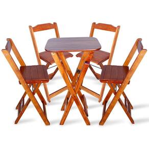 Conjunto De Bistro Com 4 Cadeiras Dobravel Para Area Gourmet - Imbuiaé ideal para bares, restaurantes, estabelecimentos, áreas de lazer e tambem para sua casa. Em madeira maciça, tornando-os resistentes e duráveis. Seu design permite que esse conjunto seja encaixado em qualquer ambiente, trazendo um toque a mais para seu estabelecimento. Além de sua durabilidade, o que lhe trará conforto para servir seus clientes. Por ser dobrável torna-se mais fácil guardar, manusear e limpar o produto.Atenção: EVITE USAR PRODUTOS ABRASIVOS E QUÍMICOS PARA LIMPEZA DO PRODUTO, aconselha-se o uso de pano umedecido para melhor conservação mantenha o produto fora de chuva e sol constantes.*imagens meramente ilustrativas*ç Medidas Mesa Bistrô: Tampo 54cm x 45cm Altura 98cmç Dimensões Cadeira Bistrô: Altura da cadeira aberta 95cm Altura da cadeira fechada 105cm Altura até o assento 61cm Largura 41,5cm Largura vão do assento 37,5cm Profundidade 43cm Profundidade do assento 32cm