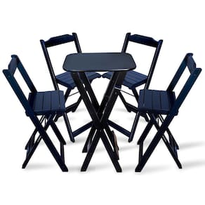 Conjunto De Bistro Com 4 Cadeiras Dobravel - Pretoé ideal para bares, restaurantes, estabelecimentos, áreas de lazer e tambem para sua casa. Em madeira maciça, tornando-os resistentes e duráveis. Seu design permite que esse conjunto seja encaixado em qualquer ambiente, trazendo um toque a mais para seu estabelecimento. Além de sua durabilidade, o que lhe trará conforto para servir seus clientes. Por ser dobrável torna-se mais fácil guardar, manusear e limpar o produto.Atenção: EVITE USAR PRODUTOS ABRASIVOS E QUÍMICOS PARA LIMPEZA DO PRODUTO, aconselha-se o uso de pano umedecido para melhor conservação mantenha o produto fora de chuva e sol constantes.*imagens meramente ilustrativas*ç Medidas Mesa Bistrô: Tampo 54cm x 45cm Altura 98cmç Dimensões Cadeira Bistrô: Altura da cadeira aberta 95cm Altura da cadeira fechada 105cm Altura até o assento 61cm Largura 41,5cm Largura vão do assento 37,5cm Profundidade 43cm Profundidade do assento 32cm Marca: TARIMATA