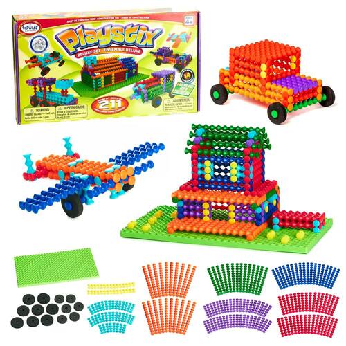Playstix Conjunto de blocos de montar de 211 peças STEM Kit - Brinquedo de construção para crianças: este conjunto de construção colorido usa comprimentos codificados por cores para facilitar para crianças a partir de 4 anos de idade para construir qualquer uma das coisas divertidas no folheto de ideias ou fazer sua própria obra-prima! - Brinquedo de aprendizagem: as crianças adoram brincar com este conjunto de blocos de construção divertido e codificado por cores que estimula a interação social, habilidades de resolução de problemas, criatividade e suporte de aprendizagem STEM - Brinquedo educativo: este conjunto ajuda a desenvolver habilidades motoras finas, capacidade cognitiva, estimula a imaginação e oferece uma maravilhosa saída para criatividade e aprendizagem, enquanto se diverte - Brinquedo de construção inteligente: cada peça Playstix tem ranhuras que se intertravam quando uma peça é colocada sobre outra. Os diferentes comprimentos são codificados por cores, por isso é fácil ver como cada modelo é construído - POPULAR PLAYTHINGS: Criamos brinquedos educativos que são benéficos e divertidos para crianças; este conjunto inclui: 196 peças Playstix, 6 rodas pequenas, 8 rodas grandes, base de construção e folheto de ideias de 50 páginas.