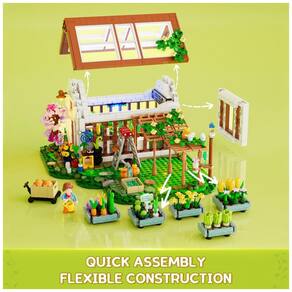 Fabricado em plástico ABS de alta precisão, o kit de 1428 peças é projetado para montagem manual avançada, compatível com coleções temáticas de fazenda e jardim. Acompanha manual de instruções e kit de iluminação LED (baterias não especificadas). Ideal para exposição e integração com outros modelos da linha Farm Flower House.