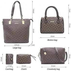 Dimensões do conjunto de bolsas bolsa grande 35,05 centímetros x 12,7 centímetros x 27,94 centímetros A bolsa Boston 25,4 centímetros x 12,7 centímetros x 19,05 centímetros A bolsa de corpo 27,94 centímetros x 10,92 centímetros x 19,81 centímetros Bolsa de mão 13,97 centímetros x 10, bolsa de cartão 6,86 centímetros x 10,92 centímetros