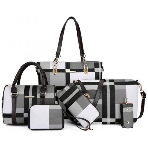 O conjunto 2E juventude inclui uma bolsa grande, uma bolsa média, uma bolsa de ombro, uma embreagem, uma bolsa e um porta chaves, oferecendo diversas opções de uso para diferentes ocasiões. As dimensões do conjunto variam de acordo com o modelo, mas todas as peças são práticas e funcionais.