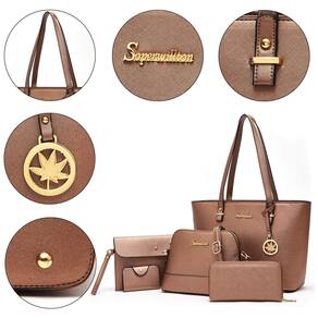 MATERIAL Feito de couro sintético de alta qualidade e forro de poliéster com ferragens de ouro duráveis. A costura é boa e corre suave e uniformemente, é agradável ao toque. Altamente anti riscos e resistente a rasgos, não é fácil ficar para a de forma. SALA Sacola Um compartimento principal, um bolso interno com zíper e dois bolsos com abertura. 5pcs Bolsa grande bolsa mensageiro carteira carteira titular do cartão. Perfeito para namorar, fazer compras, trabalhar, viajar, vocação, festa e outras ocasiões e manter seus itens diários bem organizados. DESENHOS ESPECIAIS Fechamento superior com zíper. Decorado com uma alça superior, você pode usá lo como bolsa de cima ou bolsa de ombro. Com decoração em folha de bordo parece mais fashion. DIMENSÃO Bolsa 33 x 25 x 12, Altura da alça Bolsa mensageiro 25 x 17 x , Carteira 19 x Bolsa de Mão 24 x Suporte de cartão 11 x Marca: Não Informado