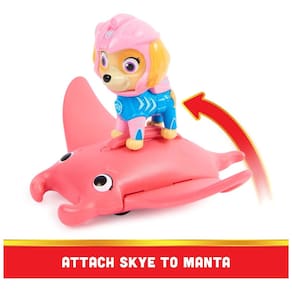 Prepare se para aventuras emocionantes de resgate em alto mar com os personagens da Patrulha Canina Aqua Pups Este conjunto de bonecos de ação inclui Skye, vestindo seu novo uniforme de neoprene, e seu amigo Manta Ray. Prenda Skye na barbatana das costas do Manta Ray e role o para ativar seu movimento de bater as asas, enquanto corre para o resgate. Este conjunto apresenta detalhes autênticos e verdadeiros, trazendo toda a diversão subaquática do programa de TV para a vida real. Para ainda mais aventuras cheias de ação, colete todas as figuras e veículos de brinquedo PAWsome Aqua Pups, juntamente com o veículo da equipe Whale Patroller, cada um vendido separadamente. Com os brinquedos PAW Patrol, as crianças podem explorar sua imaginação e desenvolver suas habilidades motoras por meio de brincadeiras de faz de conta. Os brinquedos de pelúcia e carrinhos de brinquedo PAW são ótimos presentes para crianças a partir de 3 anos.