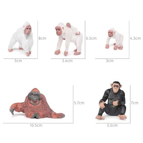 Conjunto de 5 peças de bonecos de gorila realistas — Estatuetas de PVC de orangotango, gorila branco e chimpanzé — Brinquedos de animais selvagens para crianças, brincadeiras educativas e peças decorativas, 3-10,5 cm Descrição: Material: PVC Tamanho: 3-10,5 cm Peso: 400 g Características: Estatuetas realistas de gorila: este conjunto apresenta 4 figuras de gorila de PVC altamente detalhadas, incluindo um orangotango, gorila branco e chimpanzé, perfeito para amantes de animais e entusiastas da vida selvagem. Material durável e seguro: Feitas de PVC não tóxico e de alta qualidade, essas estatuetas são seguras para crianças de 3 anos ou mais, garantindo horas de diversão e durabilidade duradoura. Educativas e divertidas: essas figuras realistas de gorilas oferecem uma maneira envolvente de educar as crianças sobre diferentes espécies de gorilas, promovendo criatividade e brincadeiras imaginativas. Perfeitas para exibição: ideais para colecionadores, essas estatuetas de gorila são peças de exibição maravilhosas em casas, escritórios ou salas temáticas, adicionando um toque da natureza a qualquer espaço. Uso versátil: esses gorilas são ótimos para brinquedos educacionais, festas temáticas na selva, dioramas ou como cobertura de bolo, dando um toque realista a qualquer celebração ou coleção. O que vem na caixa: 5 x Conjunto de figuras de gorila realistas