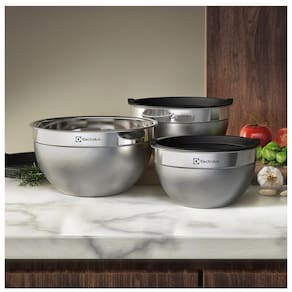 Multiuso: Este produto pode ser no refrigerador e lavado na lava-louças. Indicado para diferentes preparos: Com 3 tamanhos, atendem as mais variadas necessidades, como temperar carnes, fazer massas, servir saladas e preparar molhos. Características Tipo: Tigelas Quantidade de Peças: 03 Formato: Redondo Pode ser lavado na máquina de lava-louças Especificações Técnicas Modelo: 41049099 Material: Aço Inox Cor: Aço Inox EAN: 7909569437988 Garantia: 03 meses Capacidade 17,5cm 1,4 L 19,5 cm 2 L 22 cm 2,6 L Dimensões e Peso Dimensões do produto sem embalagem (AxLxP): 223x131x223 mm Dimensões do produto com embalagem (AxLxP): 223x131x223 mm Peso do produto sem embalagem: 0,962 Kg Peso do produto com embalagem: 1,1 Kg Itens Inclusos 01 Conjunto de Bowls Tigelas de Inox com Tampa Plástica - Electrolux