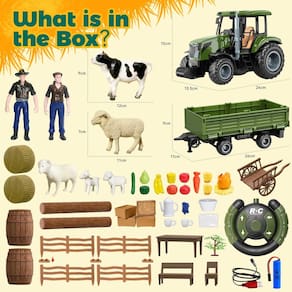 Conjunto abrangente de aventura de fazenda, este conjunto de brinquedos de trator de controle remoto vem com uma grande variedade de acessórios de fazenda, incluindo um trator, trailer, touro, ovelhas, cordeiros, galinhas, figuras de fazendeiro, cerca, árvore, fardos de feno, um conjunto de mesa e cadeira e uma variedade de frutas e legumes. As crianças podem carregar troncos, transportar barris e criar sua própria fazenda, explorando a diversão da vida na fazenda. Perfeito para crianças que amam brinquedos de fazenda, despertando imaginação sem fim. Design de bateria dupla para maior tempo de diversão equipado com duas baterias de lítio de 3,7 V 500 mAh para uso alternado, garantindo uma reprodução duradoura sem interrupções. Não precisa esperar pelo carregamento; as crianças podem mergulhar totalmente na operação deste trator de controle remoto, tornando-o um favorito entre os brinquedos de meninos de 6 anos e brinquedos de trator para crianças de 3 a 5 anos. Simulação de fazenda realista e jogo interativo. Este trator RC possui tecnologia de controle remoto de 2,4 GHz, suporta controle multidirecional e reprodução simultânea para vários usuários. O reboque destacável do trator permite que as crianças carreguem troncos e barris, oferecendo uma experiência de fazenda realista. As crianças podem simular o transporte de animais, cercas e plantações, dando vida ao papel de um "jovem agricultor". Diversão educativa para estimular a criatividade Através deste brinquedo de fazenda, as crianças aprendem conhecimentos básicos sobre agricultura e agricultura enquanto se envolvem em encenações como agricultores. Estimula a criatividade e as habilidades sociais, oferecendo uma experiência interativa. Os pais podem se juntar à diversão, promovendo laços familiares mais fortes. É uma excelente escolha para meninos de 5 anos de idade e presentes para meninos de 6 anos. Material de alta qualidade e escolha de presente ideal Feito de plástico premium, este conjunto é durável, não tóxico e seguro para crianças de 3 a 8 anos. A embalagem cuidadosa e o design versátil o tornam um ótimo presente para meninos de 3 anos de idade e presentes para meninos, especialmente para aniversários, Natal ou outras ocasiões festivas. - Conjunto abrangente de aventura de fazenda, este conjunto de brinquedos de trator de controle remoto vem com uma grande variedade de acessórios de fazenda, incluindo um trator, trailer, touro, ovelhas, cordeiros, galinhas, figuras de fazendeiro, cerca, árvore, fardos de feno, um conjunto de mesa e cadeira e uma variedade de frutas e legumes. As crianças podem carregar troncos, transportar barris e criar sua própria fazenda, explorando a diversão da vida na fazenda. Perfeito para crianças que amam brinquedos de fazenda, despertando imaginação sem fim - Design de bateria dupla para maior tempo de diversão equipado com duas baterias de lítio de 3,7 V 500 mAh para uso alternado, garantindo uma reprodução duradoura sem interrupções. Não precisa esperar pelo carregamento; as crianças podem mergulhar totalmente na operação deste trator de controle remoto, tornando-o um favorito entre os brinquedos de meninos de 6 anos e brinquedos de trator para crianças de 3 a 5 anos - Simulação de fazenda realista e jogo interativo. Este trator RC possui tecnologia de controle remoto de 2,4 GHz, suporta controle multidirecional e reprodução simultânea para vários usuários. O reboque destacável do trator permite que as crianças carreguem troncos e barris, oferecendo uma experiência de fazenda realista. As crianças podem simular o transporte de animais, cercas e plantações, dando vida ao papel de um "jovem agricultor" - Diversão educativa para estimular a criatividade Através deste brinquedo de fazenda, as crianças aprendem conhecimentos básicos sobre agricultura e agricultura enquanto se envolvem em encenações como agricultores. Estimula a criatividade e as habilidades sociais, oferecendo uma experiência interativa. Os pais podem se juntar à diversão, promovendo laços familiares mais fortes. É uma excelente escolha para meninos de 5 anos e presentes para meninos de 6 anos - Escolha de presente ideal Feito de plástico, este conjunto é durável, não tóxico e seguro para crianças de 3 a 8 anos. A embalagem cuidadosa e o design versátil o tornam um ótimo presente para meninos de 3 anos de idade e presentes para meninos, especialmente para aniversários, Natal ou outras ocasiões festivas