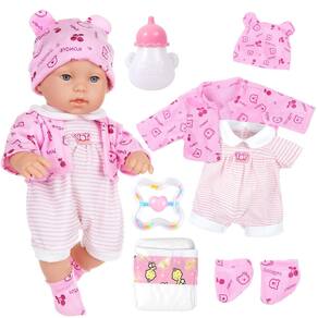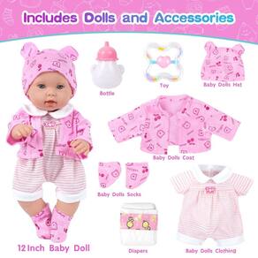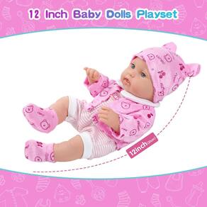 - Lista de pacotes: boneca de bebê de 12 polegadas, 1 conjunto de roupas de boneca, 1 mamadeira, 1 bico, 1 fralda, 1 anel