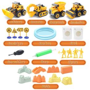 Este conjunto de brinquedos de areia para construção manterá seu pequeno engenheiro ocupado por horas em seu próprio canteiro de obras. Nossos brinquedos de areia para construção incluem areia de brincar de 2,2 libras, 4 brinquedos grandes para caminhões de construção (caminhão basculante, escavadeira, rolo de estrada), 1 caixa de areia, 8 figuras de trabalhadores da construção civil e sinais de trânsito, 8 moldes.