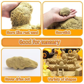 Melhor areia sensorial tem a textura e fluidez da areia comum, tem plasticidade. É fácil de moldar, não pegajosa, não seca e gravável. Funciona perfeitamente com os caminhões de construção e os moldes do castelo.