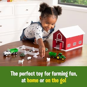 - Conjuntos clássicos de fazenda: os brinquedos de fazenda britânicos trazem a você um charmoso conjunto de fazenda infantil 1:64. Com 24 peças, incluindo um trator John Deere , vagão e caminhão, figuras de animais (4x brinquedo de vaca, 4x brinquedo de ovelha), 6 fardos de feno, 6 peças de cerca e um celeiro vermelho icônico, tem tudo o que é necessário para horas de diversão.