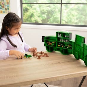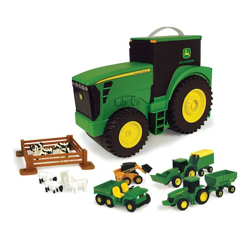 Organizador de armazenamento de brinquedos: o A maleta de transporte portátil em forma de trator possui 10 compartimentos separados para até 25 brinquedos de fazenda - Colecionável Brinquedos: este conjunto de brinquedos John Deere apresenta veículos de brinquedo, vagões, cercas e animais de fazenda, tudo em uma caixa de brinquedos.