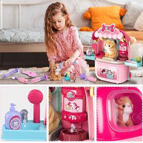 -?Mala de transporte para animais de estimação 2 em 1?A nova caixa de armazenamento portátil atualizada foi projetada para se tornar não apenas uma mesa de brinquedos, mas também uma mala de viagem. Este kit de cuidados médicos para animais de estimação pode ser transportado para facilitar a viagem e o armazenamento. Todas as peças podem ser armazenadas nele. As crianças podem levar o brinquedo para qualquer lugar e cuidar de seus amigos de estimação aonde quer que estejam.