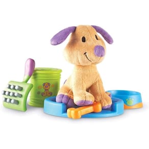 Pronto, pronto, cuide do seu animal de estimação! Cuidar desse precioso filhote convida o brincar imaginativo e constrói vocabulário e habilidades sociais precoces. Perfeito para incentivar o role play enquanto ensina as crianças sobre as responsabilidades associadas ao cuidado com animais de estimação. Inclui um cachorrinho de pelúcia, cama de cachorro, tigela de cachorro, osso, escova e lata de ração para cães. Puppy mede 6&Prime-H.