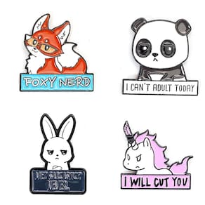 Material: liga. Quantidade: você receberá todas as peças em quantidade igual à primeira foto principal. ShowCartoon Style — inclui quatro broches com uma raposa com “Foxy Nerd”, um panda com “I Can't Adult Today”, um coelho com uma frase sarcástica e um unicórnio com “I Will Cut You”. Material de liga — Feito de liga forte com revestimento de esmalte liso, garantindo cores brilhantes, resistência a arranhões e brilho duradouro. E prático — Cada alfinete de lapela é confortável de usar em jaquetas, chapéus, blusas ou mochilas sem adicionar peso extra. Acessório moderno — Alfinetes de blusa, broche ou crachás perfeitos para roupas escolares, casuais, festas temáticas ou roupas do dia a dia. & Trendy — Adequado para homens, mulheres e adolescentes que gostam de alfinetes de lapela esmaltados divertidos, inovadores e inspirados em animais com citações engraçadas.